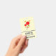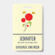 Name tag with a charming drawing of several whimsical red flowers with fat hearts attached to a green stem. 2 yellow butterflies hovering nearby. Sketched with a black outline. Whimsical and cute design.