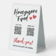 Romantic table tent wedding honeymoon fund sign with a combination of a charming hand-writing script and a modern sans serif, personalised with two QR codes and your names, and with two cute red hearts. QR code honeymoon fund sign with two hearts and your names.