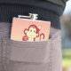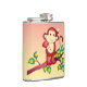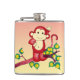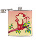 This flask presents a cute red monkey with a long curling tail on a tree branch surrounded by green leaves.