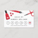 Cute loyalty card for your nail business with red nail artist tools and little gems. Add your name too. The loyalty punch card is for the sixth visit or treatment at a discount, with a red heart marking it. Write your name, business, and contact information on the back with black text on a white background with red as the accent colour.