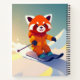 cute red panda in a colourful snowboarding outfit gliding down a snowy mountain
