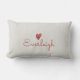 A cute girl's lumbar pillow for her bedroom or dorm room decor with her name in scrip and a signature little red hand painted heart. A greta back to school gift.