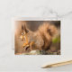 Side profile of a cute Red Squirrel with bushy tail and ears, carrying a nut in his mouth. Photo by Tony Wood