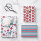 A trio of matching wrapping paper sheets with a medical theme. One features a cute pattern of thermometers, stethoscopes, bandaids, hearts with an ecg curve, and medicine on a white background. One features a pattern of hearts with ecg curves. And one has matching stripes in red, white, and blue.