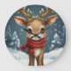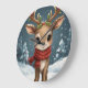 This clock features a happy reindeer standing in falling snow.