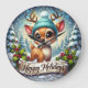 This whimsical clock features an adorable, wide-eyed baby reindeer wearing a blue pom-pom beanie, standing in a snowy winter forest. Its antlers are decorated with colorful, glowing Christmas lights. A large banner across the bottom reads "Happy Holidays," and the scene is framed by holly and red berries. The design may look real due to the high detail and three-dimensional texture in the artwork.