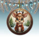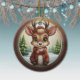 This reindeer ornament features a round, brown wooden frame that gives it a rustic and cozy look. Inside, a Christmas scene unfolds with a cute baby animal deer with antlers, in a cartoon graphic art style, wearing a sweater, hat and scarf, standing in the foreground. The background includes soft, wintry elements like Xmas trees and distant winter snow landscape, completing the holiday season charm of this delightful unique doe lover illustration decoration. Same fawn decor design is on the front and back. This ensures that no matter how the present turns, it always looks festive and complete.
