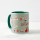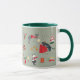 Cute retro Christmas illustration with cats around the Christmas tree, looking presents, all-over print pattern on green background. Original artwork by Caroline Bonne Müller