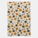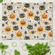 This design presents a cute and whimsical Halloween pattern filled with a delightful assortment of classic spooky icons. The background is a light cream colour, providing a soft contrast to the bold designs. The pattern includes playful jack-o'-lanterns with different expressions, black cats with bright yellow eyes, smiling skulls, and friendly bats with orange wings. Scattered throughout are spiders, crescent moons, stars, mushrooms, and magical symbols, all adding to the enchanting Halloween atmosphere. The colour palette features striking blacks, oranges, and yellows, creating a lively and festive design perfect for Halloween decorations, clothing, or party themes. The overall feel is fun and charming, ideal for celebrating the spooky season with a touch of sweetness.