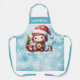 It's a funny personalised Christmas apron with a cute robot holding a cookie, wearing a red Santa hat, sitting near a cup of hot cocoa and a Christmas tree. This design is in snowy blue and red colours for festive vibes during the holiday season.