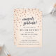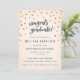 These super chic, feminine graduation announcements feature rose gold polka dots, grey hand-lettered text and a soft buff watercolor background.