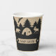 Cute kraft brown and black camping birthday party paper cups. Featuring a tent, a moose, and a bear with a textured kraft brown and black background. Birthday boy or girl's name front and centre - easy to change for your camping party!