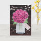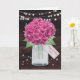Sweet rustic pink floral birthday card featuring pink hydrangeas and baby's breath inside a mason jar against a rustic wood background. String lights and twinkle stars add a magical charm to this cute floral design. A floral tag with 'Happy Birthday' custom text on the front and a big floral heart with a message inside.