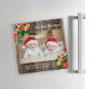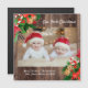 Christmas holiday greeting square magnet card for families with new twins (or any number of new babies). Customisable text says, "Our first Christmas" and is on a rustic wood background decorated with red poinsettias, green leaves, and striped candy canes.