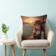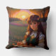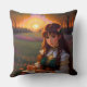 Cute Sad Anime Style Woman in Meadow at Sunset Cushion