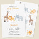 Adorable watercolor baby elephant, lion and giraffe safari design which is perfect for an animal or wildlife lover's baby shower invitation. You can easily customise the invite to your liking by changing any of the text. Gender neutral for a boy or girl. Original art by Nic Squirrell. Reverse features a matching baby animal pattern.
