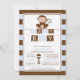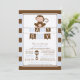 Modern jungle safari monkey baby shower invitation featuring a cute little monkey set on a blue & brown stripe background with a rattle accent and pendant banners. Flip our boys baby shower invite over to view a matching back for an extra special touch. Perfect for a monkey theme, jungle theme or safari zoo theme little baby boy shower.