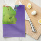 A kitchen towel with a cartoon illustration of a little monkey peeking out from behind a green bush. Surrounded by a wreath of tropical leaves. Set on a purple gradient background.
