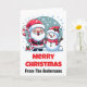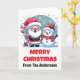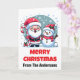 A cute whimsical Christmas illustration featuring a jolly Santa wearing his traditional red and white suit and hat, sporting a big white beard and a red nose. He is holding a big red and white striped candy cane and is standing next to a happy snowman. The snowman is also wearing a red and white Santa hat with holly leaves and berries on the brim and a red scarf around his neck. He has coal for eyes and buttons, a carrot nose and sticks for arms. He has a happy smile and rosy cheeks. Below are two templates, one to add your seasonal message and the other to add your name.