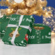 Modern, elegant, and cute Christmas wrapping paper, with an image of a unicorn pulling Santa's sleigh (full of gifts), the text "Merry Christmas & Happy New Year 20XX" in stylish script / calligraphy handwriting, and a personalised name. With sprinkles of white and silver snowflakes and a pair of golden Xmas bells and a red ribbon, each with a sprig of holly, on a Xmas green background.