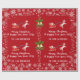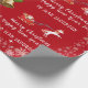 Modern, elegant, and cute Christmas wrapping paper, with an image of a unicorn pulling Santa's sleigh (full of gifts), the text "Merry Christmas & Happy New Year 20XX" in stylish script / calligraphy handwriting, and a personalised name. With sprinkles of white and silver snowflakes, and a pair of Xmas bells with a sprig of holly, on a Xmas red background.