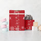 Modern, elegant, and cute Christmas wrapping paper, with an image of a unicorn pulling Santa's sleigh (full of gifts), the text "Merry Christmas & Happy New Year 20XX" in stylish script / calligraphy handwriting, and a personalised name. With sprinkles of white and silver snowflakes, and a pair of Xmas bells with a sprig of holly, on a Xmas red background.