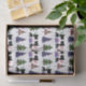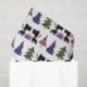 Adorable Scottish terriers giving gifts sandwiched between buffalo plaid Christmas trees. Cute tissue paper for dog lovers.