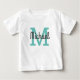 A cute monogrammed bay boy tee with a whimsical hand drawn style letter font contrasted with a script type in grey black and blue green initial for contrast. A cute style for a baby boy.