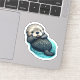 The sticker features a cute sea otter floating on its back, holding a small fish in its paws.