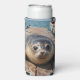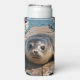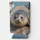 An adorable can cooler featuring a cute seal sitting on a boat dock by the ocean just look sweet as can be.
