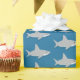 Shark wrapping paper with a pattern of cute, little, sharks on a blue background. Go get a roll or two for yourself and enjoy covering any present, every present, in sharks.
