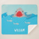 This cute shark fleece blanket makes a great personalised gift for any baby. The design features a large shark mouth and teeth accented by water waves and smaller sharks.