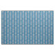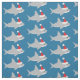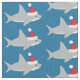 Fabric with a pattern of cute, smiling, sharks in Santa hats on a blue background.