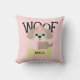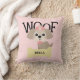 This adorable pillow shows a cute shih tzu puppy dog with a pink hair ribbon, and sitting near a gold coloured boned that you can personalise with your dog's name. "Woof" appears in big fun black letters behind the dog. The background is filled with soft pink and white polka dots. Graphics by Sanqunetti Design at Mygrafico.