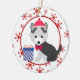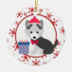 On the front of this Holiday ornament is a cute grey Siberian Husky puppy wearing a cap and bow tie. Beside him is a blue striped Christmas gift. The images are placed on a white oval framed by a retro red snowflake pattern. The back of the ornament has the same background and oval with your custom text in two fields. Cute! *Thanks to Gift Season Shop for the dog image in this design.
