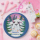 A fun Paper Plate to Personalise, with two cute Penguins having fun, ice-skating, in a snowy landscape with fir trees and a setting sun; from a hand-painted paper collage by Judy Adamson. The background and text colour shown here can be changed if there's another dark colour you prefer.