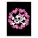 Cute skull and crossbones with polka dotted bow surrounded by pink hearts and flowers.