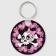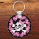 Cute skull and crossbones with polka dotted bow surrounded by pink hearts and flowers.
