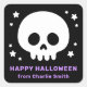 Square Happy Halloween stickers featuring a cute, white skull with stars around it. Below the skull are custom text in a bold, purple font “Happy Halloween” and your name. Black background. All colours are customisable.