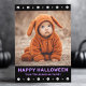 Send spooky cheer with this customisable Halloween photo card featuring a playful black background with white skulls and little stars. The layout includes a large customisable photo, perfect for showcasing your children, a family portrait, or even a group of friends in costume. Below, bold purple text reads “HAPPY HALLOWEEN,” with a customisable name underneath, adding a festive pop of colour against the dark backdrop.
