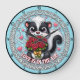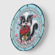 This circular wall clock features a charming, cartoon-style illustration of a cute baby skunk holding a bouquet of red roses. The skunk has large purple eyes and the classic black and white coloring. The scene is set against a bright, light-blue background and framed by an ornate silver-colored filigree border, giving it a dimensional look. The background also contains floating pink hearts and arrows. Bold red text across the bottom reads "LOVE IS IN THE AIR!". The entire design is a highly detailed print, and the silver border is not real metal.