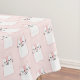 A tablecloth with a cute pattern of sleeping kitty cats looking peaceful and happy. On a pink background.