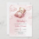 Gorgeous design for girl Baby Shower invitations features Cute sleeping teddy bear in pink sky and clouds. Modern kidish calligraphy font lettering with heart.