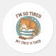 This adorable sticker features a cosy orange tabby cat snoozing in a striped coffee cup, surrounded by twinkling stars and warm vintage tones. Perfect for anyone who loves cats, coffee, or naps! With the funny phrase “I’m So Tired, My Tired Is Tired,” this design captures the ultimate mood for sleepy mornings and late-night study sessions.