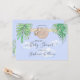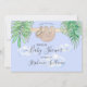 This cute baby shower invitation features a sweet baby sloth hanging from a branch, framed with green watercolor jungle leaves and clouds on a blue background.