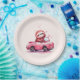 Paper plates with an adorable illustration. A happy looking sloth sitting in a sporty pink convertible. Waving as he drives by. With hearts floating upwards.