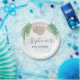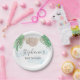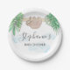 This cute baby shower paper plate features a sweet baby sloth hanging from a branch, with green watercolor jungle leaves and turquoise clouds.