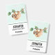 Name badge with an adorable sloth hanging upside down from a tree branch. Tree branch is decorated with tropical leaves and berries.