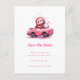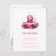 Save the date postcard with an adorable illustration. A happy looking sloth sitting in a sporty pink convertible. Waving as he drives by. With hearts floating upwards.