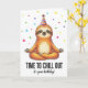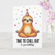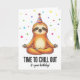 Send relaxing birthday wishes with this adorable card featuring a cute sloth meditating in a lotus pose, wearing a colorful party hat! The text reads, "TIME TO CHILL OUT it's your birthday!" Perfect for anyone who loves sloths, yoga, or just needs to take it slow on their special day.